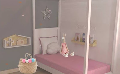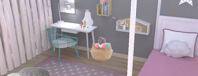 Detalhes como prateleiras com livros pertinho dela para ler antes de dormir, cestos para guardar coisas, muitas coisas, posters coloridos, prateleiras que dão para brincar às casinhas. Uma cadeira menta para dar destaque à zona de estudo. Um tapete enorme onde cabe uma tenda e muitas almofadas pelo chão. Um cabide em forma de nuvem junto à porta, com chuva cor de rosa e tudo...