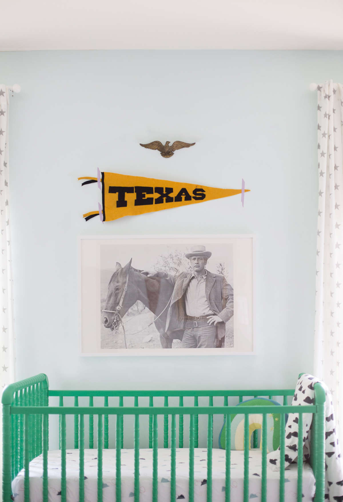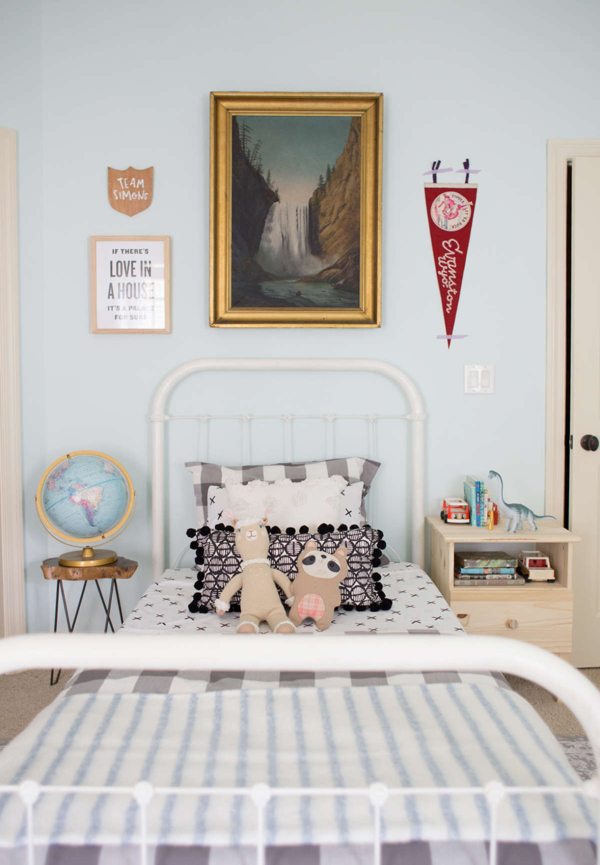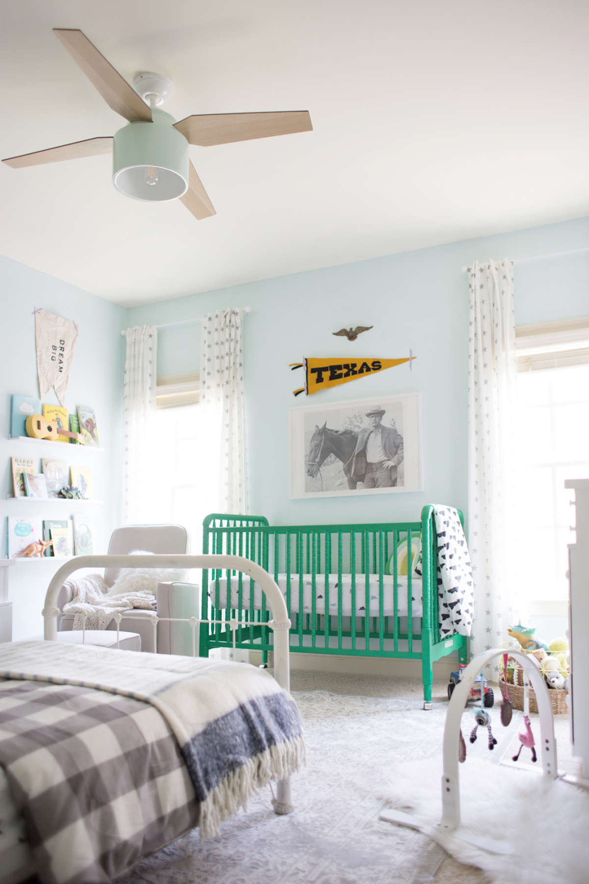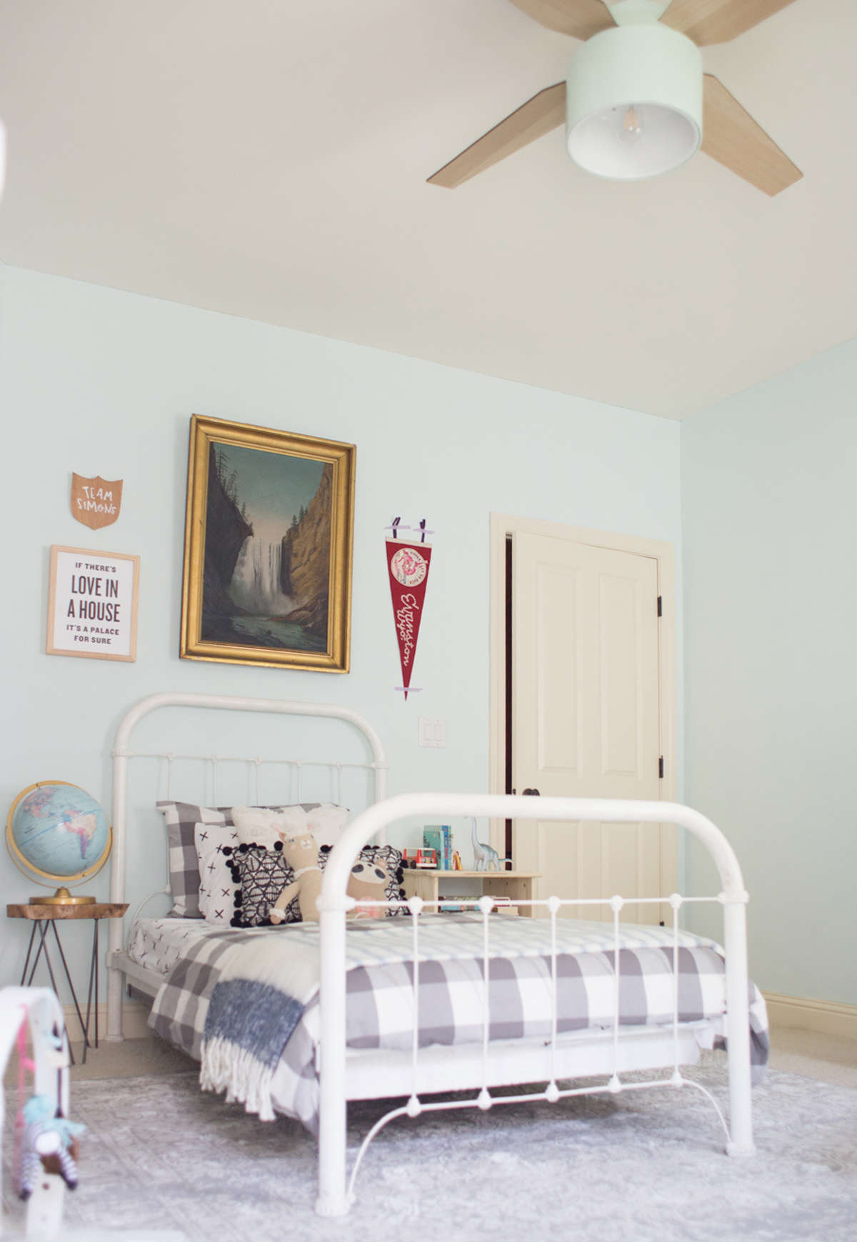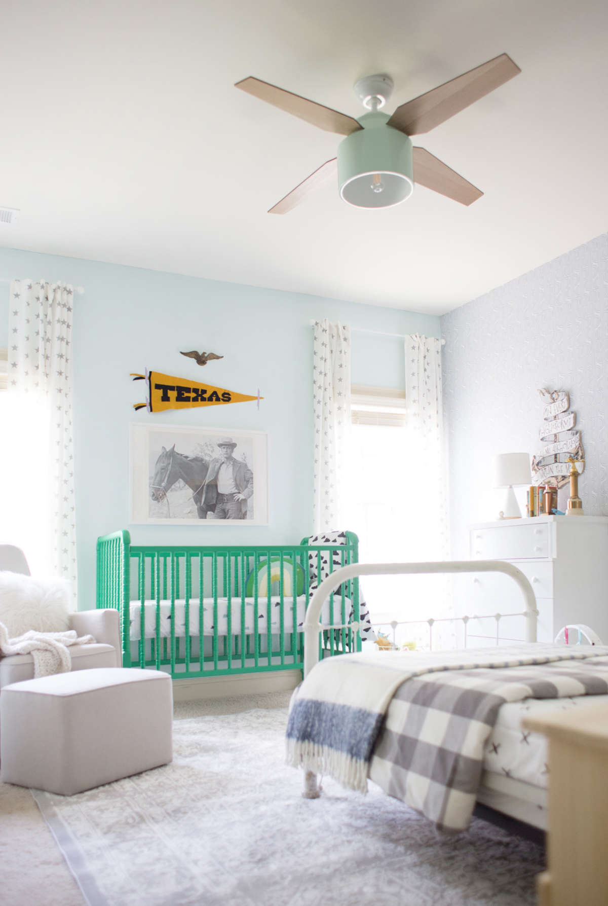 A delicadeza do candeeiro de tecto com ventoinha, a caminha de grades como peça statement do quarto, o toque country sem ser exagerado, a mistura de padrões.